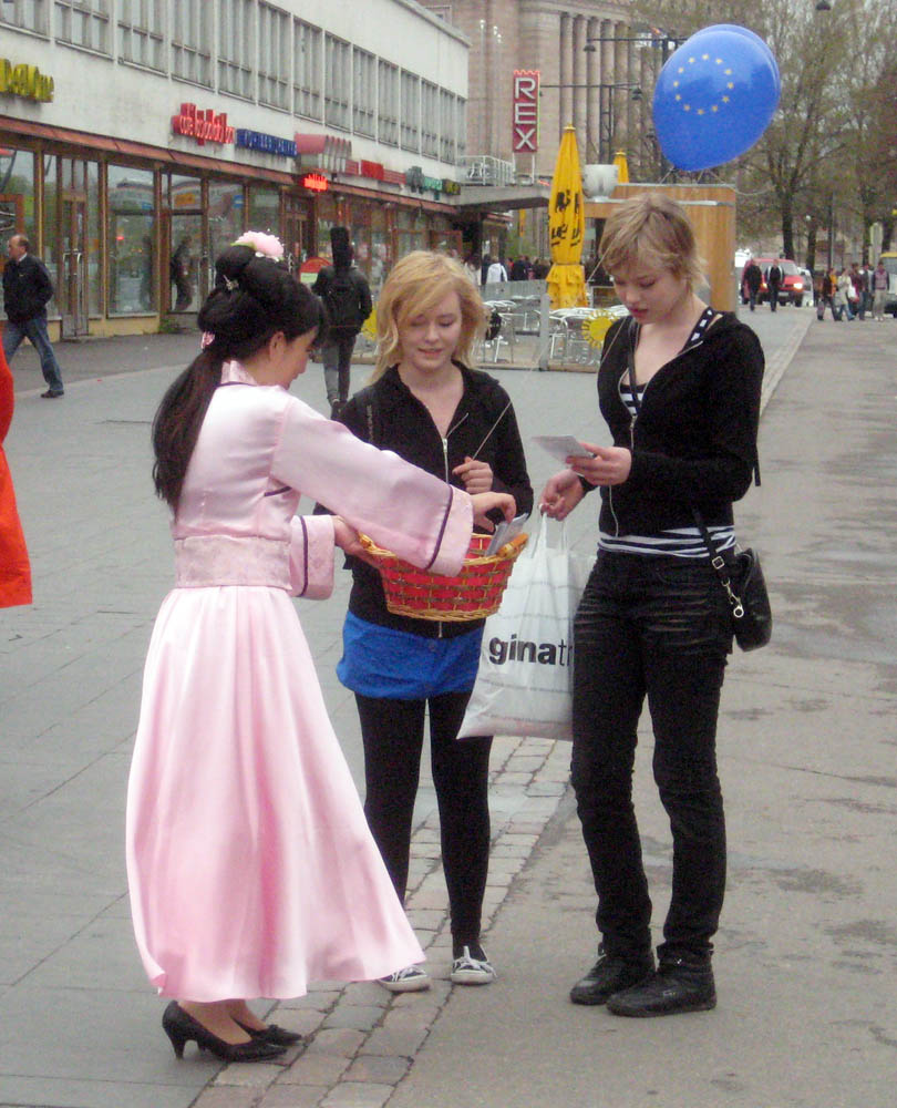 Anna是一个美丽的芬兰姑娘,她身穿汉服,脸上挂着甜美的微笑,和其他学员一起庆祝世界法轮大法日。她亲切地和人们交谈,介绍大法的美好,非常高兴地与人分享她修炼大法的幸福和喜悦:“一个非常偶然的机会,我的男朋友在森林里散步,看见一位女士在炼法轮功,回到家里来他跟我讲了他看到的,我就想,我要炼这个。我并没有和他在一起看见什么,我听了就想炼了。”她说,她修炼后整个人都变样了,“我修炼前很压抑,总是担忧什么,希望每个人都喜欢我,我还很自私,生活对我来说很痛苦;修炼后我不再那么担心了,我感觉很快乐,心情总是好,总是微笑,我的身体也越来越健康,我感觉身轻如燕。”