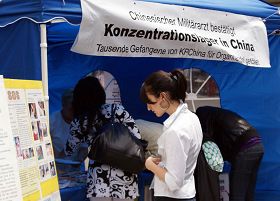 ![]() 路人认真看展板,签名支持法轮功 |
