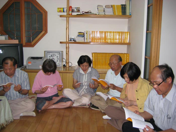 左起彭清孟、月娥、华美、彭清一、蓓玲、彭清廉,大家一起读法轮功书籍