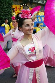 穿着仙女服装的女学员们在优美的音乐伴奏下表演了中国传统舞蹈,另一组身着中国传统服装的学员打着腰鼓,庆祝法轮大法洪传十七周年。喜庆、热闹的场面吸引了过路的人们,他们纷纷走上前来了解详情。听了学员的介绍,人们对信仰“真善忍”的法轮大法非常感兴趣,对中共迫害善良的法轮大法修炼者表示愤慨。
