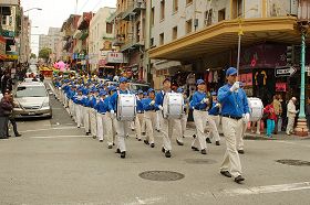 五月二十三日,天气凉爽。旧金山市中心联合广场的很多游客被法轮功天国乐团的优美音乐所吸引,不少行人驻足观看。来自英国的弗雷德夫妇表示,他们被美妙的音乐所吸引,就停下来欣赏。弗雷德说:“我们在英国也听说过法轮功以及发生在中国的对法轮功的迫害。今天在这里看到你们(法轮功学员)在这里演奏,非常高兴,太美了。法轮功学员的队伍中,年老的、年少的,什么年纪的人都有,真是祥和。每个人都应该有信仰自由。随着网络的流行,越来越多的中国人会了解真相。”