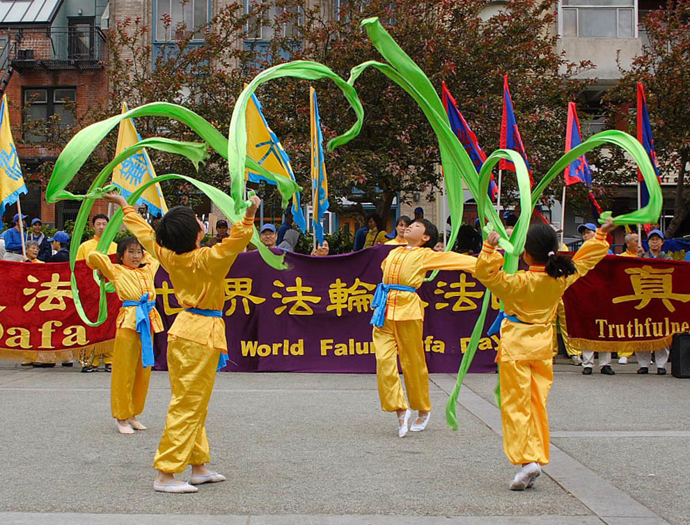 在中国城花园角广场的庆祝集会上,法轮功学员们表演了舞蹈等,表达对师父慈悲救度的感恩,吸引了许多当地民众围观欣赏及共同庆祝,热闹非凡的场面覆盖了整个中国城广场。