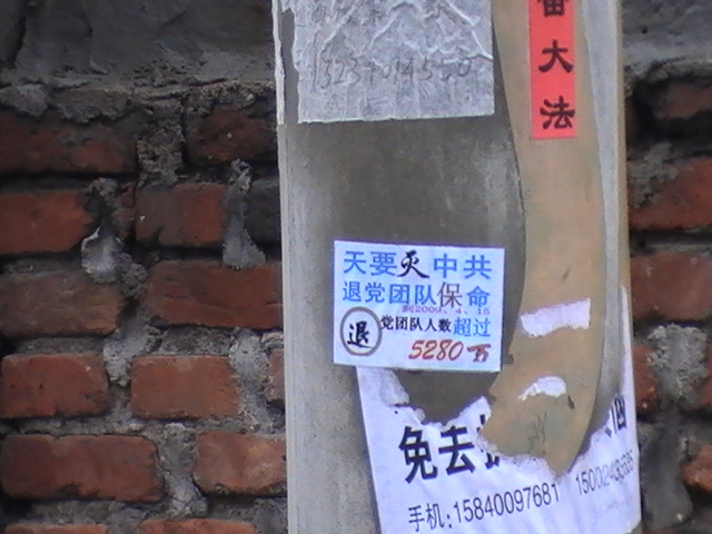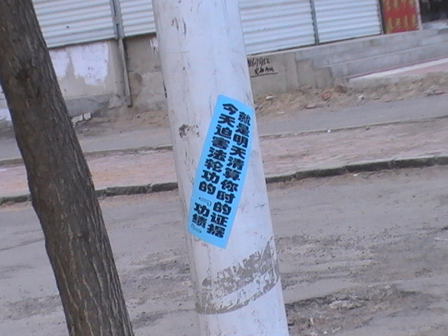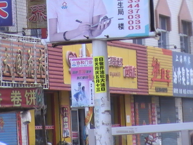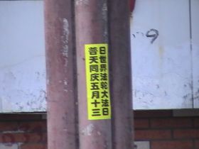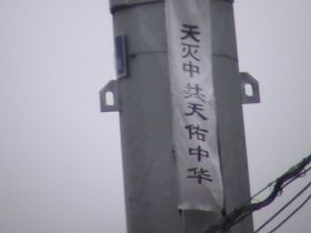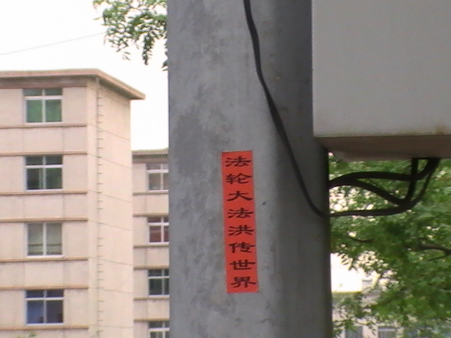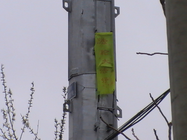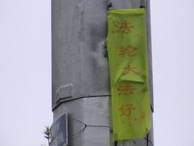 【明慧网二零零九年五月二十五日】辽宁省某县五月十三日前,大街小巷陆续出现不干胶条幅庆祝世界法轮大法日,同时呼吁停止