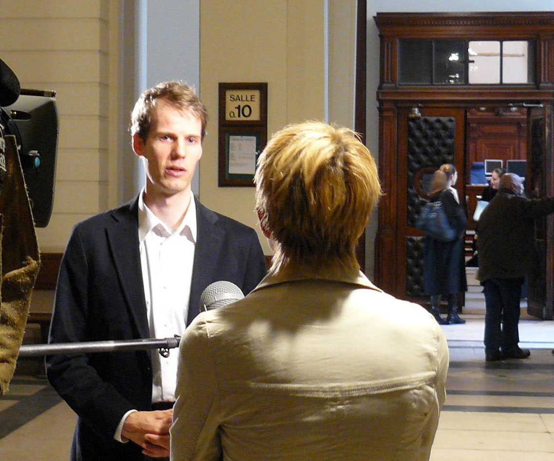 ![]() 原告之一的比利时法轮功学员尼古拉斯(Nicolas)在比利时高等法院接受比利时国家电视台采访。 |