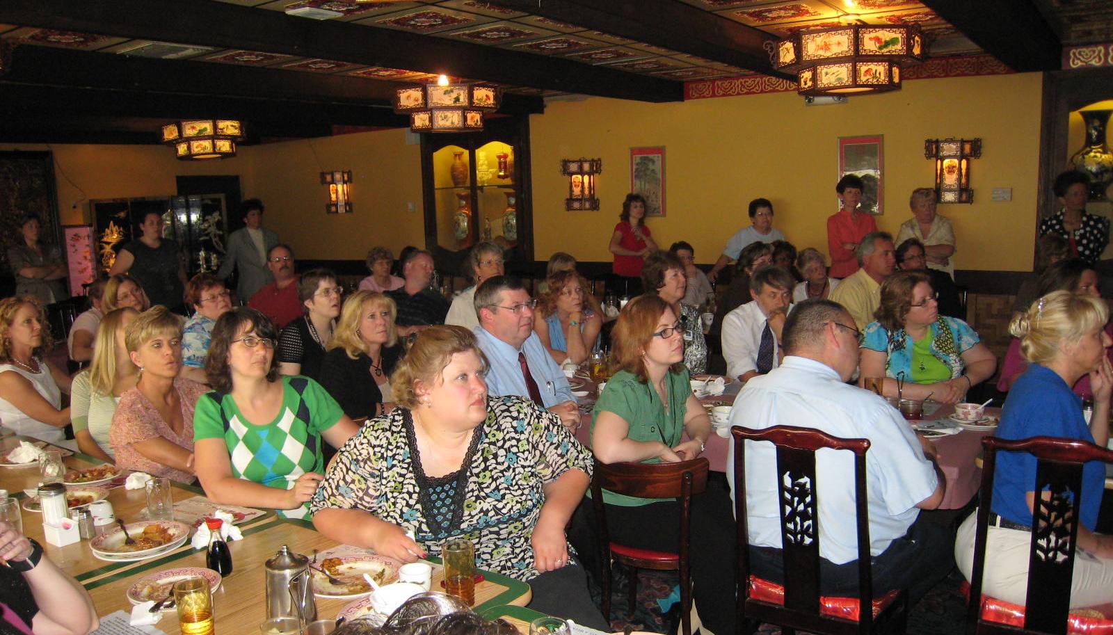 活动在一家中餐馆的大餐厅举行。大厅里座无虚席,约有六十名员工前来了解法轮功。一位学员首先以幻灯片向大家介绍法轮大法遭迫害前在中国洪传的盛况、现在在世界洪传的情况,以及中共对法轮功修炼者长达十年的非人迫害。接下来,她介绍了法轮功功法的 特点,然后其他学员演示功法。