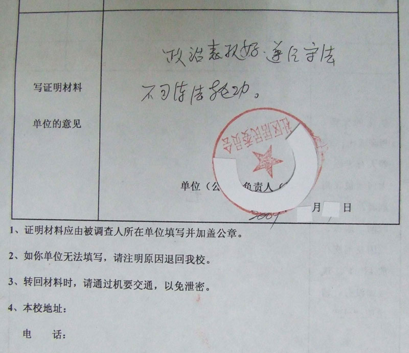 共产邪党对法轮功的迫害将近十年了,迫害范围无处不及,株连九族,波及家庭和亲友。在高中毕业生登记表中,有一写证明材料处,由居委会填写、盖章。居委会强行写上不炼法轮功字样,并说:“必须这样填写”。这是对法轮功修炼者及其家属的变相迫害,也是对高考生及其家属的迫害。
