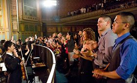 ![]() 演出结束时,全场观众纷纷起立长时间鼓掌向演员致意。 |