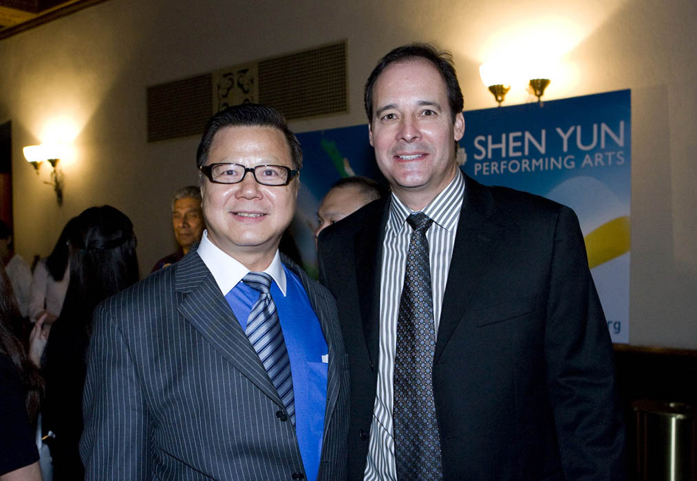 前侨务委员、圣盖博百老汇歌剧团经理廖钦和偕夫人和朋友、圣盖博市议员马里欧(Mario De La Torre)前来观看了神韵艺术团今晚的演出。在看完上半场演出后他激动地表示:神韵演出的各个方面都非常精彩,尤其是《迫害中我们屹然走在神的路上》的舞蹈令他“热泪盈眶”。