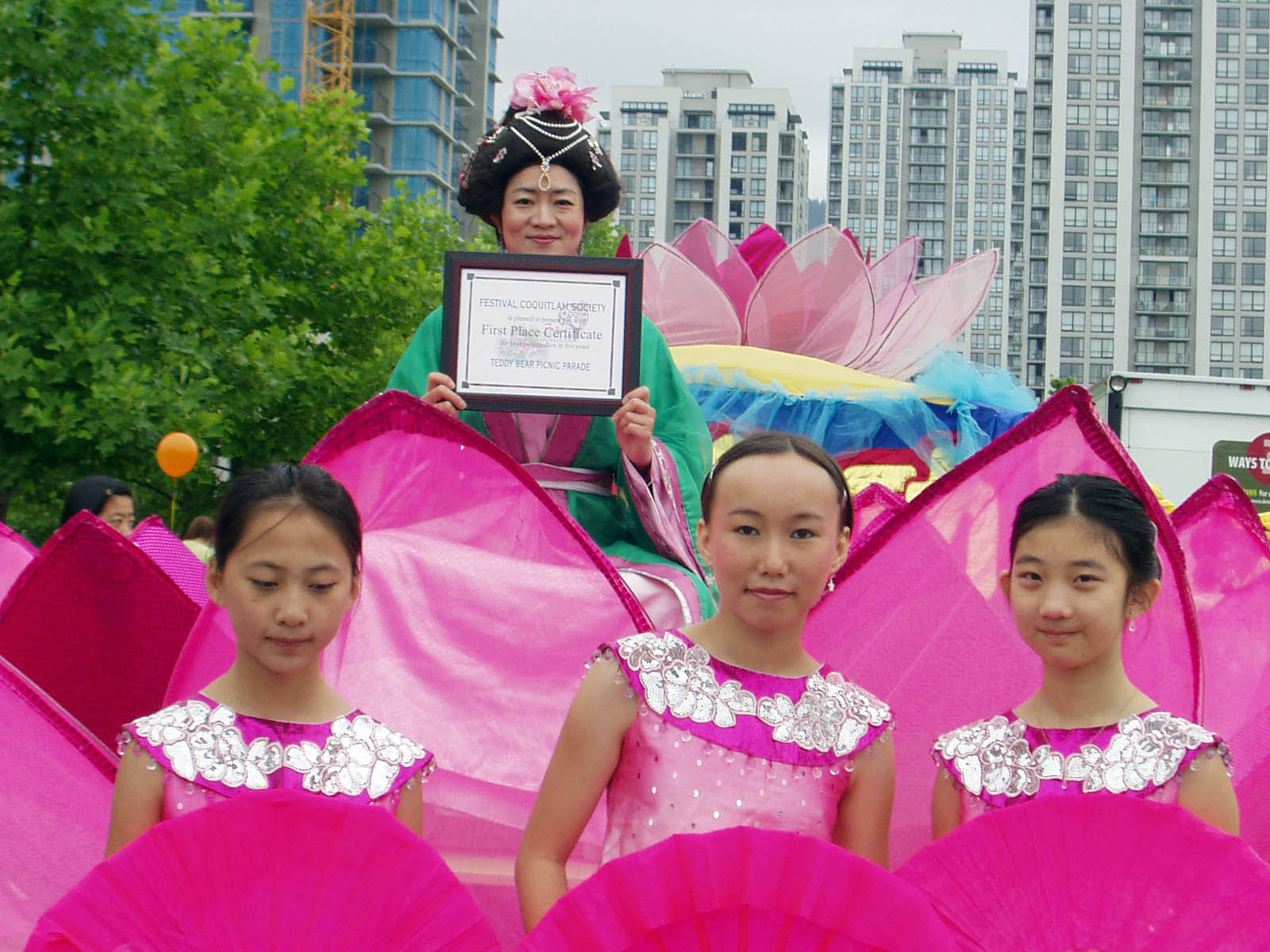 法轮功学员的游行队伍中,身穿中国传统服装的天国乐团走在前面,后面是精美的花车上学员表演法轮功功法、其后是小弟子的仙女队、老年大法弟子组成的腰鼓队,一路上浩浩荡荡,不断博得路边观众的热烈掌声,许多人随着军乐的鼓点舞动。