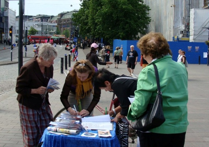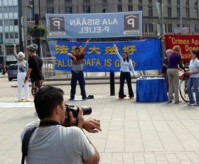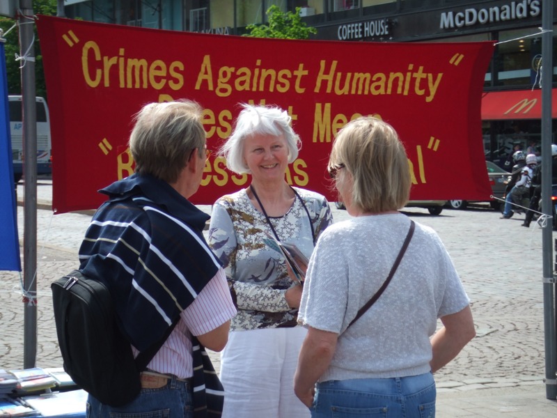 一位高级工程师Jyrki,看着“crimes against humanity does not mean business as usual”(迫害人权不是一般的罪行)横幅很久,并与学员讨论这个横幅的含义。学员告诉他,现在中共在劳教所非法关押法轮功学员,法轮功学员每天被迫奴役劳动十几个小时,做那些出口到国外的商品,这就是为什么很多中国制造的商品那么便宜,因为手工费不用花一分钱。还有的法轮功学员甚至被秘密地活体摘取器官,被共产党当作商品在出卖。Jyrki听完后表情很沉重,他对法轮功学员说:“你们做得太对了!”