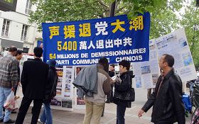 周末的美丽城聚集了众多华人,在喧闹嘈杂的街区,穿梭来往的人群中,传来了希望之声国际广播电台的录音节目,号召所有加入过中共邪党、团、队的人们,赶快退出,抹去邪灵兽印,迎接光明美好的未来。清亮的声音,娓娓道来,上下地铁的人们都不禁停住脚步,专注倾听,有的索要一份《大纪元时报》和《九评共产党》。当场,有三十人声明退出中共及其相关组织。一个年轻的中国小伙接过报纸,高兴地说:“我最爱看大纪元了。”