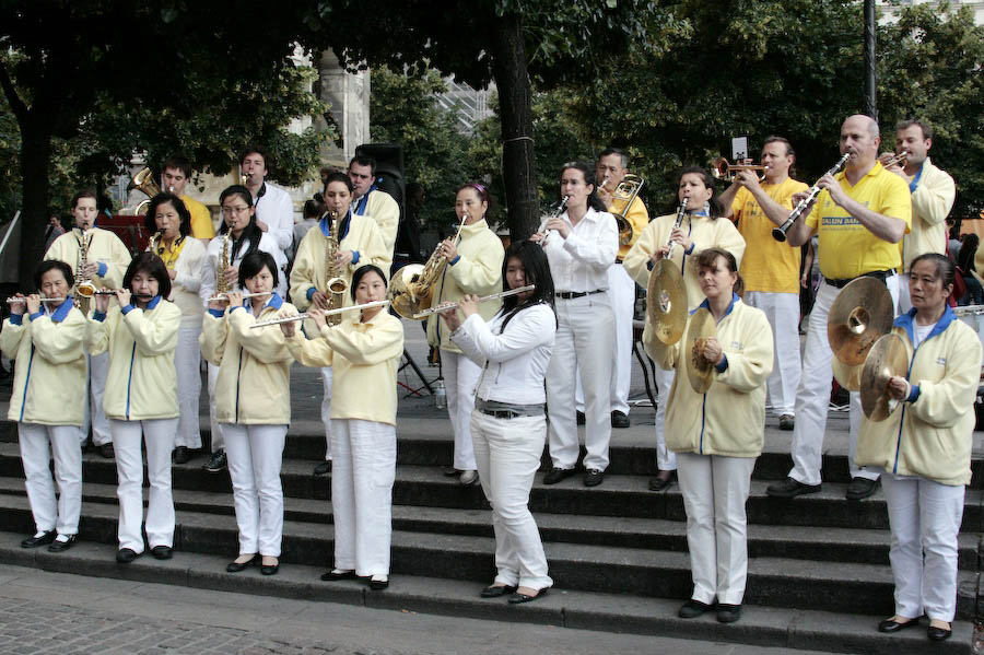 ![]() 法轮功学员演奏“法轮大法好”、“法鼓法号” |
