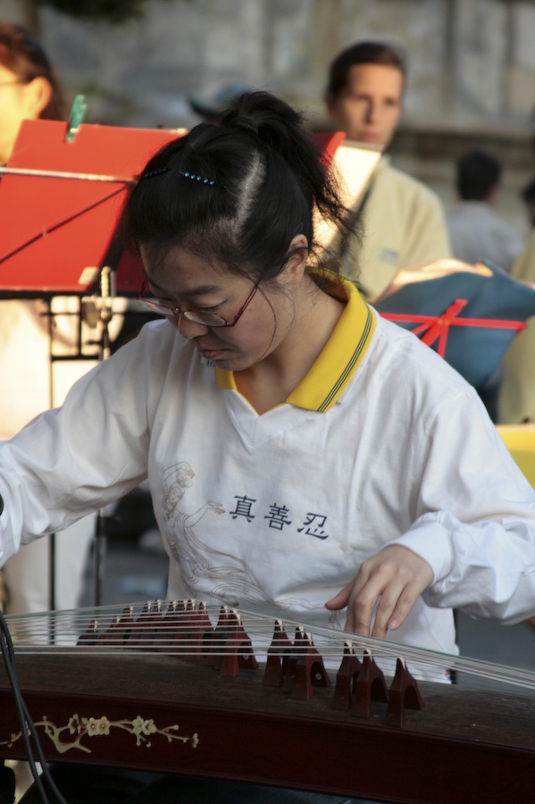 “法轮大法好”、“法鼓法号”振奋人心;“欢乐颂”亲切和美;笛子独奏“缘”,如泣如诉,告诉人们碰到的所有人,都是有前缘的,要珍惜今世的缘;古筝演奏,让人们领略中国古典音乐高山流水般的清雅……