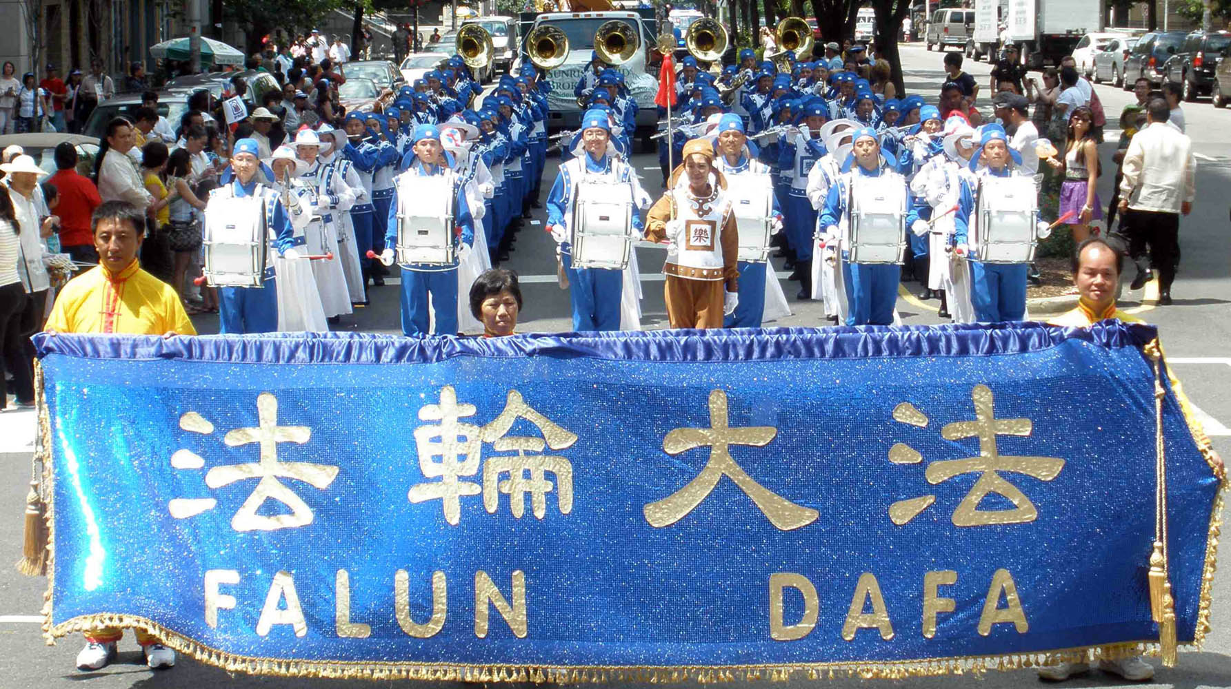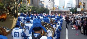 ![]() 天国乐团在行进中演奏“法轮大法好” |