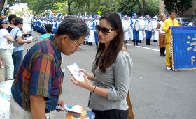 当了解到法轮大法的美好和在中国无辜遭受的迫害后,一位老先生对法轮功学员沈女士说:“人们不要期待中国人能够自然而然地获得信仰和表达的自由,因为那里是共产党。”一位年轻女士则说:“这么好的法轮大法竟然受到迫害,只能说那个共产党确实是不可理喻。”