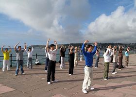 周六清晨,学员们来到番赞兹海边集体炼功。
