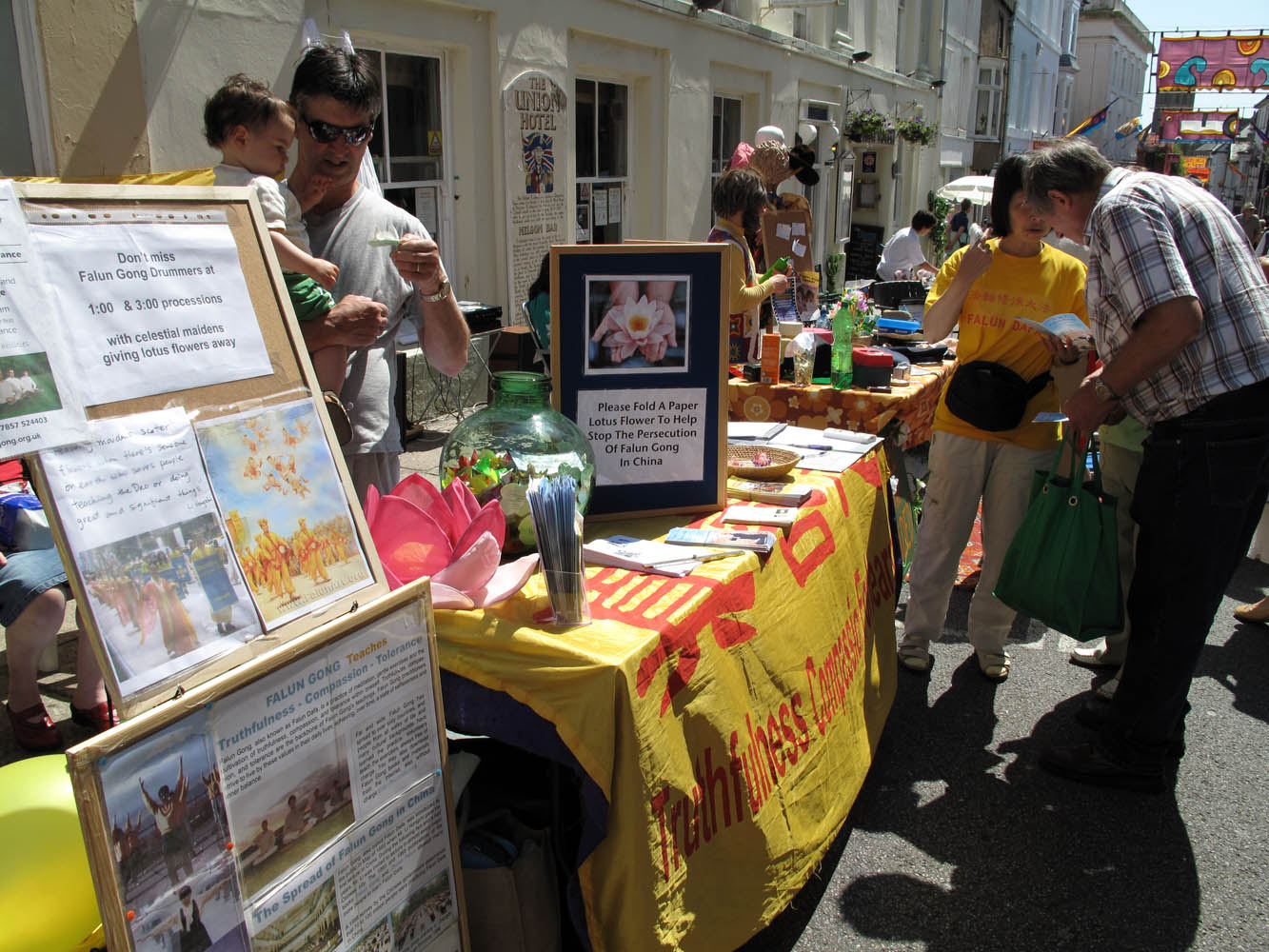 当地法轮功学员还在节日庆祝的主要街道上申请了展位,一整天摆设了法轮大法信息台。桌子上摆满了各种真相资料,一个很大的透明玻璃瓶里装满了悬挂着“法轮大法好”书签的莲花,桌子上面摆有介绍资料,鼓励人们亲手叠一个莲花,并为制止中共迫害法轮功助一臂之力;信息台的另一侧放有谴责中共迫害的征签表。