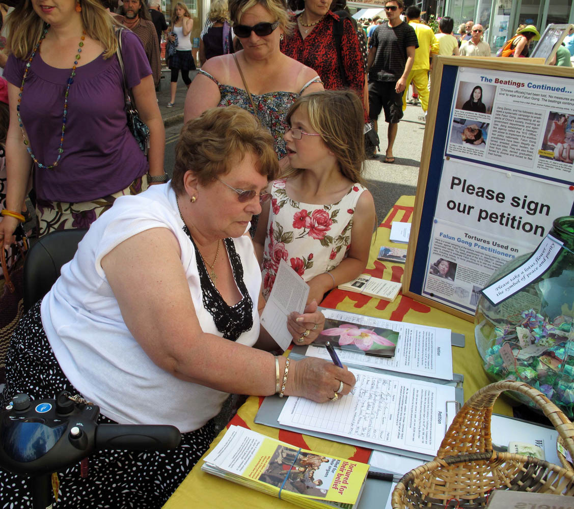这对夫妇签字离开后,记者正后悔没有给他们留下一个镜头,这时又有一位坐在电动轮椅车上的女士在展位前停下签字。很多家长鼓励孩子来签字,一位英国女士自己签过字后征得身边同行的母亲同意后又代替母亲签了一次。一位女士直接来到展位前在征签表上签字后,还主动和学员说:“我是基督徒,我知道基督徒在中国受到的限制和迫害,因此我了解法轮功为什么被迫害,被迫害的人应该站在一起。”接着,她手指着法轮功学员高蓉蓉被迫害毁容的照片严肃而坚定地说:“当最后的大审判到来时,那些作恶的坏人一定会受到惩罚。”