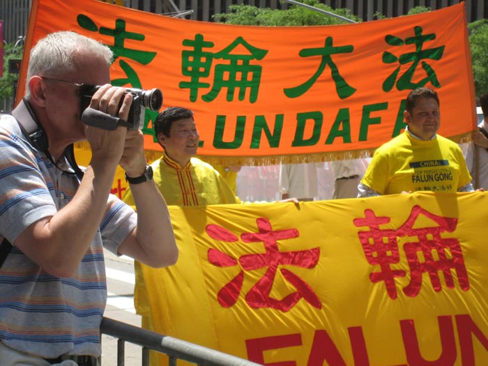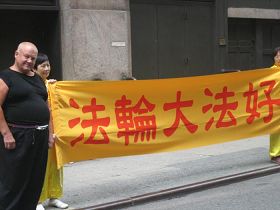 在行进中,不断有民众拍手或竖起大拇指表示支持,有些观众更是热情地高喊“Good luck, we are with you!(祝你们好运,我们和你们在一起!)”其中有一位身穿黑衣的老先生特别引人注目,因为他拿着手机仔细录下横幅的每一个字和法轮功学员的炼功姿式。交谈下,得知这位先生叫MIEZYSLAW,是一位在纽约住了二十年的俄国人。
