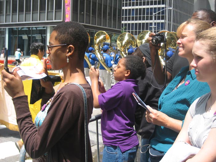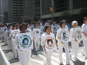 来自世界各地的法轮功学员陆陆续续加入,数千法轮功学员在曼哈顿“呼唤良知 停止迫害”的大遊行正热闹登场;在天国乐团雄浑的“法轮大法好”乐声的前导下,第一个是展现“大法洪传”的方阵,第二个则是表现“中原蒙难”方阵,第三个方阵是“解体中共 制止迫害”,最后一个方阵是“法轮大法好”。