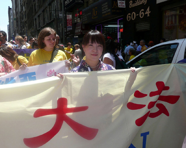 来自加拿大渥太华的凯茜(Kathy Gillis)修炼法轮功十一年了,“法轮大法不仅令我身体健康,还使我的生命更富有意义。以前,我觉得我应该有所作为,但不知道该做什么,(修炼大法后)我找到了。”凯茜手里举着呼吁制止中共迫害法轮功的横幅,对此,她说,“当第二次世界大战的时候,在集中营中所发生的屠杀是令人发指的。那时我还是个孩子,我非常震惊人们没有做出足够的努力去制止那样的悲剧,我也很震惊那时大人们没有告诉我发生着什么。我发誓,不能让那样的事重演。”走在游行队伍中,凯茜呼吁人们关注迫害,早日制止中共的暴行。
