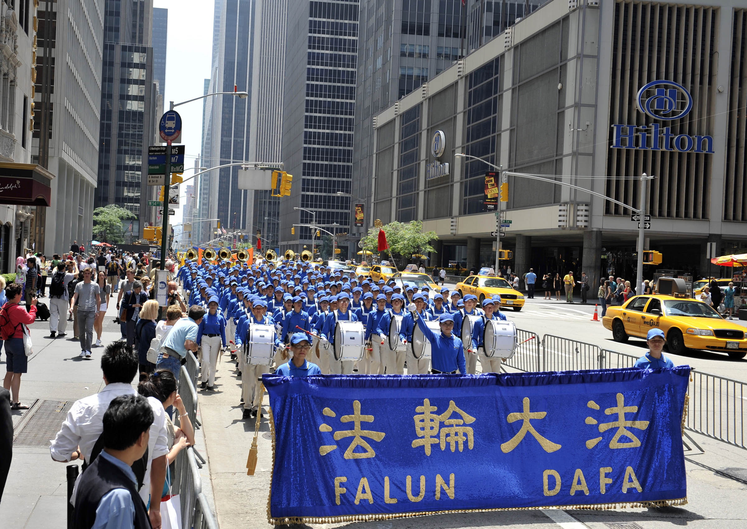 游行的第一方阵上百人的天国乐团开路,一首首《法轮大法好》、《法鼓法号震十方》、《法正乾坤》、《法轮圣王》在曼哈顿的高楼大厦之间回荡着,赢得了路人、司机和商家们的瞩目。来自全球四十多个国家的学员举着美丽庄严“法轮大法在各个国家”的横幅,自豪的告诉世人法轮大法在世界上这么多国家这么多民族洪传,每个人都有机会学法轮功。