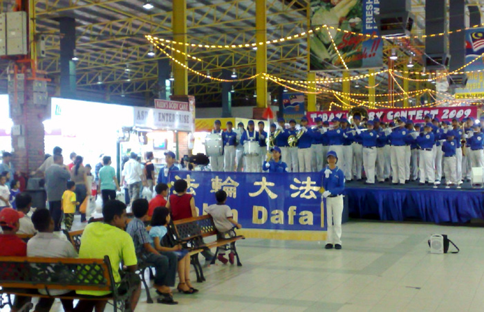 当天晚上,天国乐团又转赴其它的超级市场和百货商店,总共进行了五场演出。六月七日,从下午两点半开始天国乐团在新山市的演出进入了高潮。在一所人潮如涌的大型购物中心演出时,天国乐团演奏了三次《法轮大法好》,公众都被那优美的乐曲声所感动:一位马来人的女性收银员眼中闪现出激动的泪花,还有许多观众在演出结束后不愿意离去,继续跟随天国乐团到另外的楼层观赏演出。