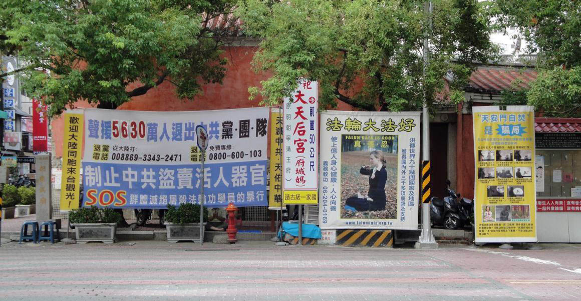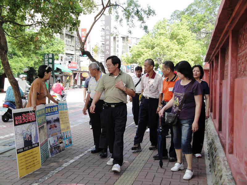 两岸开放,众多中国游客来台观光,赤嵌楼是他们来台南必访之地,这些人来到赤嵌楼,首先被眼前的大横幅所震撼:声援五千多万中国勇士退出中共党、团、队,制止中共活摘器官,法轮大法好,天安门自焚是骗局。游客们情不自禁地互相讨论并拿起相机猛拍,有些人还会特地走到对面以便看得更清楚,这时放在横幅后面的数十片展板也能映入他们的眼帘。有人看得目瞪口呆,有人发出会心的微笑,有人立即索取《九评共产党》一书。