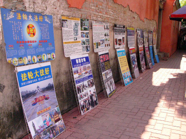 ![]() 横幅背后靠着武庙墙壁的法轮功真相展板 |