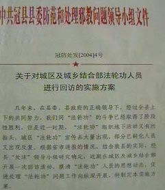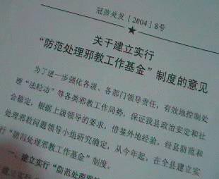 为了加强迫害,冠防处发【2004】8号文件(据鲁“六一零”办发【2003】33号文件《关于涉法轮功问题有关具体政策的意见》),内容是为了迫害法轮功,建立实行“防范处理×教工作基金”制度,要全县给它送钱,赏举报和迫害“有功”人员。