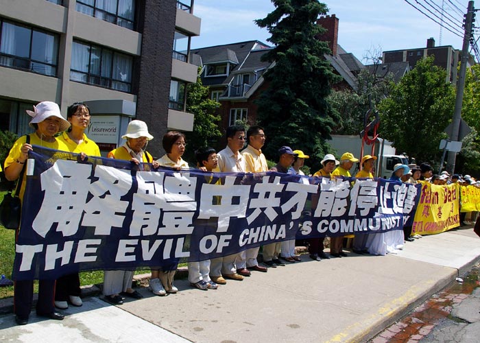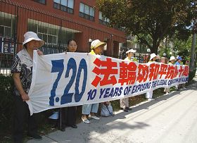 ![]() 二零零九年七月二十日,多伦多法轮功学员在中领馆前集会,吁制止迫害。 |