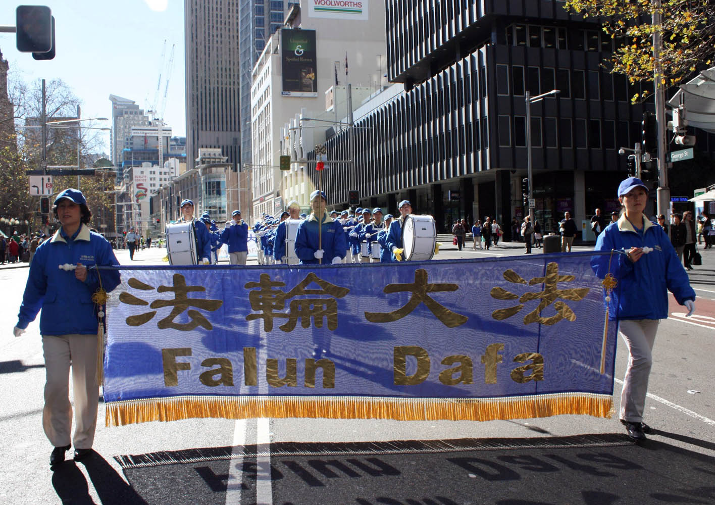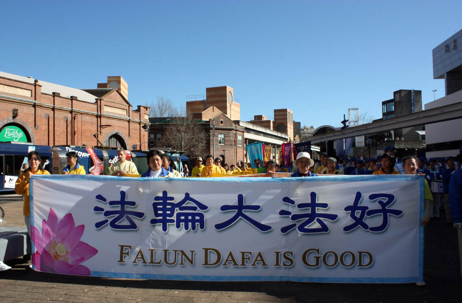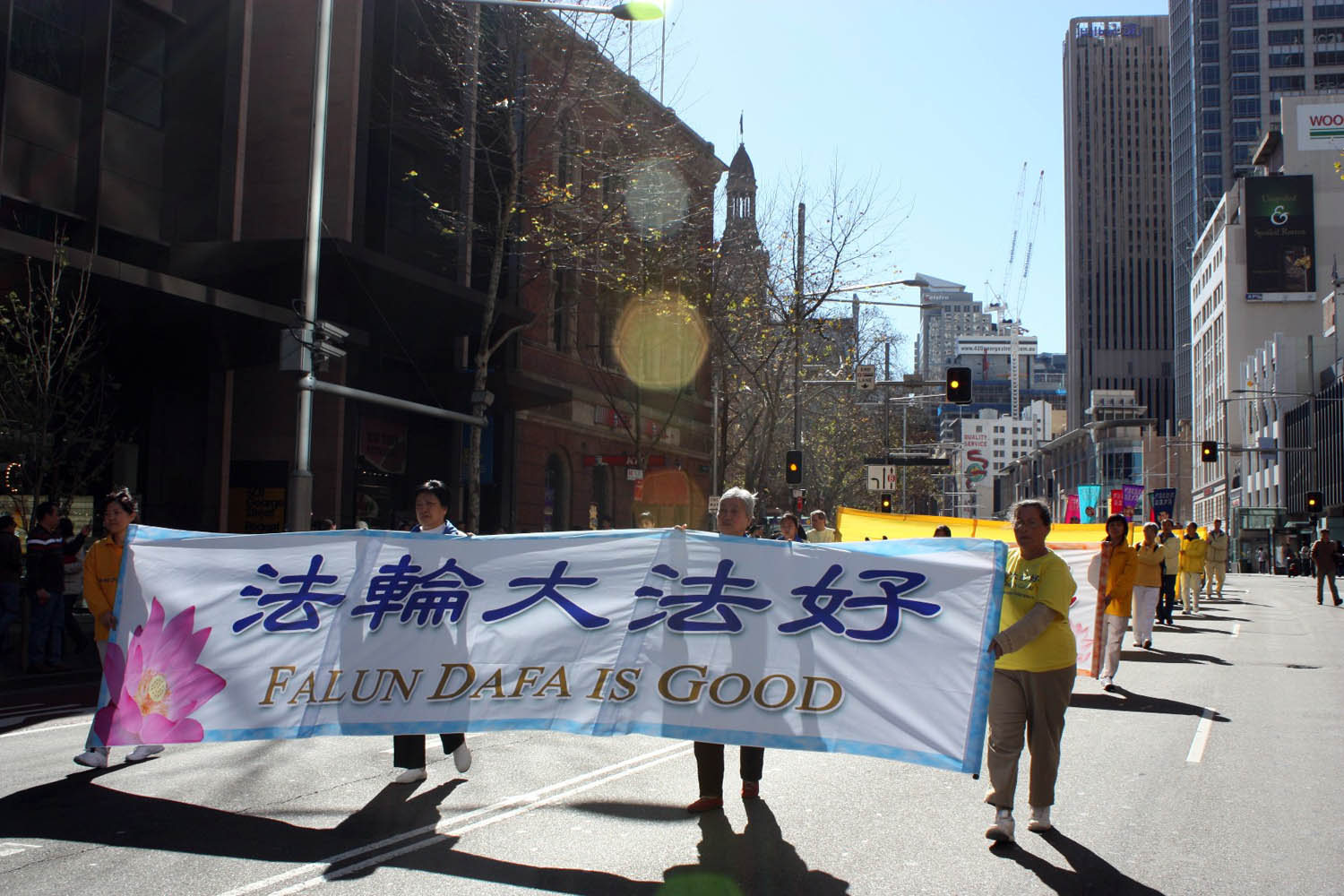 队伍经过悉尼市中心主要街道,祥和理性、声势浩大,吸引路人驻足观看。游行队伍到达终点悉尼唐人街旁的娱乐中心广场后,举行了“七·二零”法轮功十年反迫害集会活动。