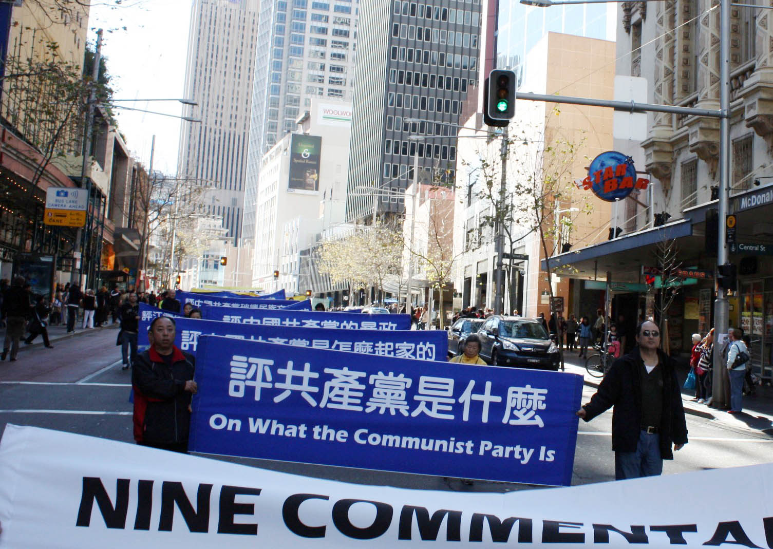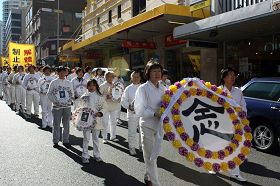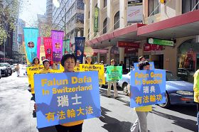 游行队伍从悉尼市政厅出发,以天国乐团开路,由“法轮大法洪传世界”、“和平非暴力反迫害历程”及“九评共产党引发退党大潮”三大部份组成,呼吁善良民众伸出援手,共同结束中共对法轮功的迫害。
