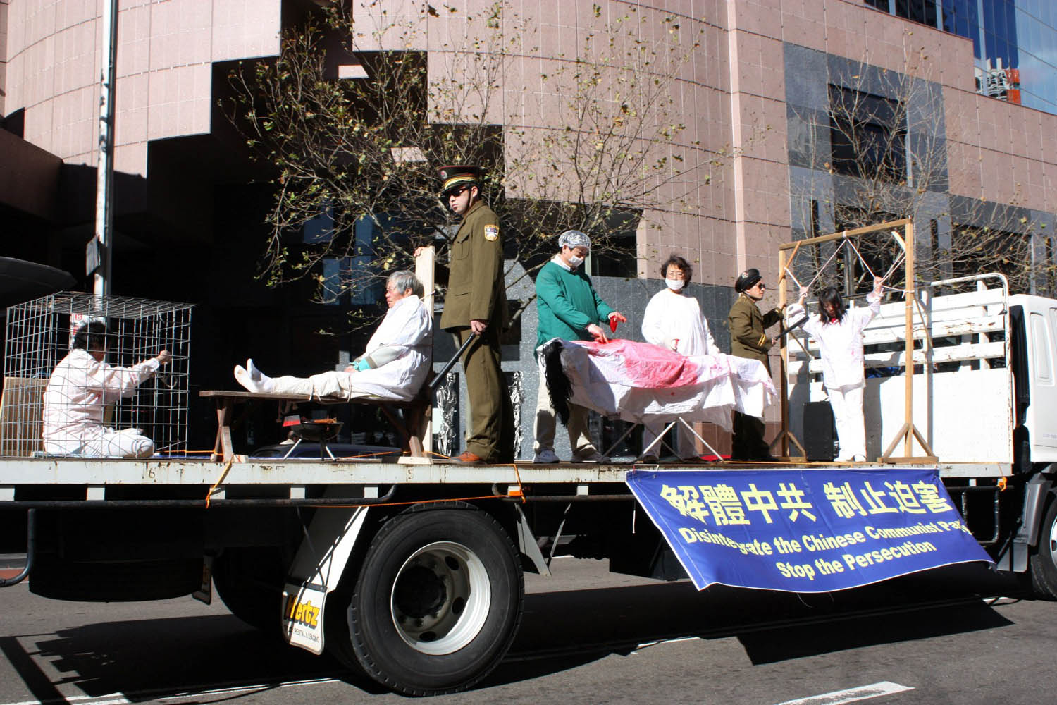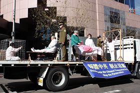 唯一的展车上模拟演示着在中国法轮功修炼者所承受的无名苦难。紧随其后是上百名素衣白鞋学员手持被中共迫害致死的中国大陆同修的照片缓缓而行,肃穆而壮观,告诉着人们这场迫害的惨烈。