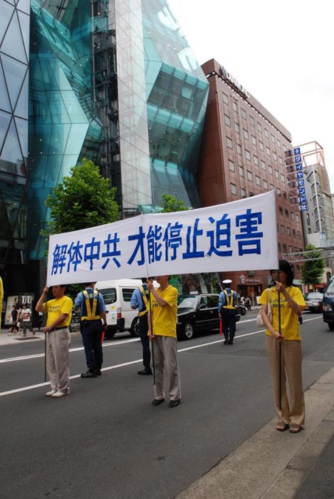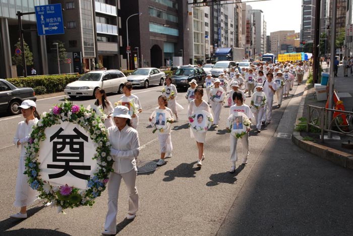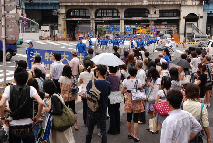 集会之后法轮功学员开始从位于繁华市区的惠比寿公园到青山的约两个小时的游行,虽然天气炎热,因为是公共假日的最后一天,街上依然行人众多,也有来自其它国家的观光客。记者看到人们被眼前出现的这支队伍吸引,对天国乐团的演奏耳目一新,纷纷以游行队伍为背景拍照摄像,看着法轮功学员遭受酷刑的展板及身穿白衣手捧被迫害致死同修遗像的方阵表情凝重,默默无语。许多人仔细阅读接到的法轮功真相单张,有的人询问更多情况。