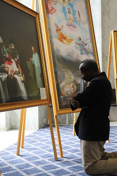 来自弗吉尼亚州的政府官员穆罕默德先生(Ibrahims Mohamed)到国会来参加听证,恰好看到这里在办美展,被吸引驻足观看。他对法轮功学员受到的极端残酷迫害感到非常悲伤。他是一位来自索马里的移民,对迫害曾经感同身受,这些画触发他对过去的回忆,他很难过。
