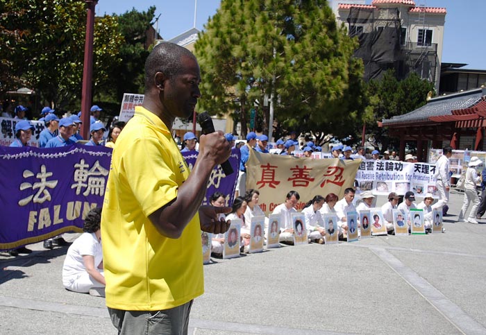 旧金山市议员克里斯·戴利特别来到会场。他说:“我怀着悲痛的心情来到这里,因为我想到十年来在中国大陆被迫害的法轮功学员。同时我也感到欣慰,中国的法轮功学员那种坚忍不屈的精神令我敬佩。作为法轮功的朋友,我可以告诉大家,法轮大法好!真善忍的原则,我们不光要信奉,而且要传给所有的人。我们要谴责所有迫害法轮功的暴徒。在旧金山市政厅,我永远都为你们发言!”