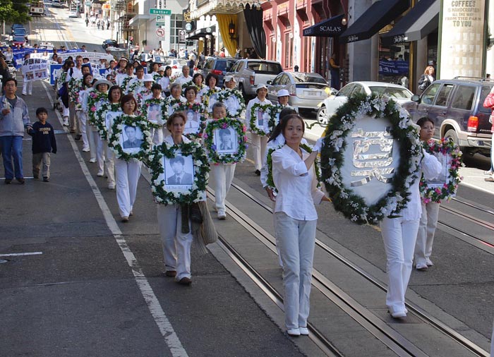 下午三点,游行从花园角广场开始。游行队伍的最前面是“和平呼唤良知 停止十年迫害”、“法轮大法好”和“世界需要真、善、忍”大横幅,后面,数十位身穿白色衣衫的法轮功女学员,捧着被中共迫害致死的部份中国法轮功学员遗像,神情庄严肃穆。