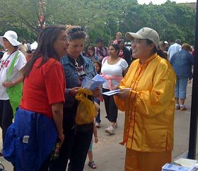 法轮功学员现场赠送了许多小莲花卡片,很受欢迎。当注意到这上面写着“法轮大法好,真、善、忍好”,人们都非常珍视;有的说去年已经得到了,一直珍藏着。