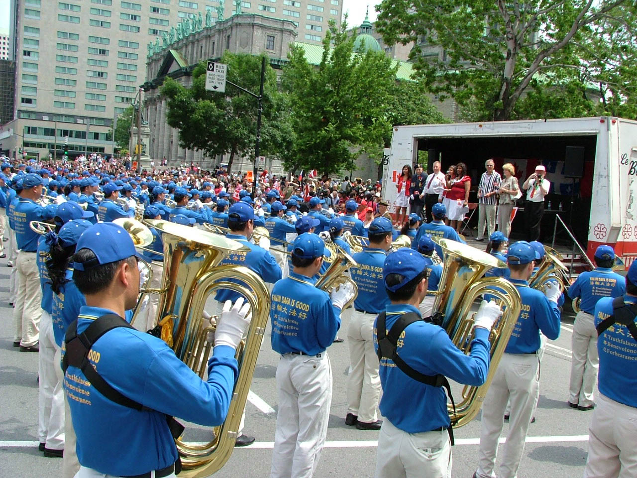 身着印有“法轮大法好”和“真善忍”字样的蓝色T恤,来自纽约和蒙特利尔超过百名法轮功学员组成的天国乐团的队伍,是本次游行中一道亮丽的风景线。天国乐团沿途一遍遍演奏《法轮大法好》、《法鼓法号震十方》、《法正乾坤》、《送宝》、《法轮圣王》和《永远的枫叶》等曲目。乐团所到之处,引来道路两旁观众的阵阵欢呼声和掌声。随着乐团行进,学员将介绍法轮功的传单递给观众,许多人迫不及待地从传单上寻找更多的法轮功信息。