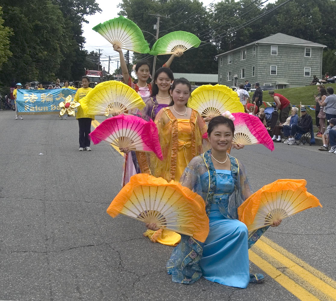 今年法轮功游行方阵包括花车、扇子舞及唐鼓表演。精神抖擞的法轮功学员、震撼人心的鼓声、优美的舞姿加上花车上的功法展示,博得观众热烈的鼓掌。法轮功传单供不应求,许多民众争相接阅,四、五千份传单不到游行结束就全部散发完了。
