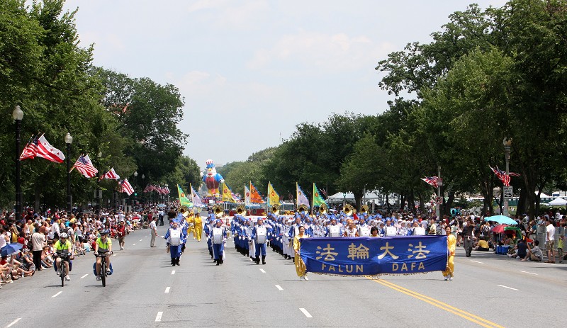 ![]() 2009年7月4日,法轮功团体第八次应邀参加美国首都独立日大游行,由天国乐团、旗队和腰鼓队组成,是所有参加游行的团体中规模最大的。 |