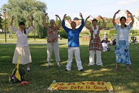![]() 法轮功学员在小公园炼功,向人们介绍功法。 |