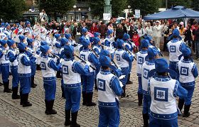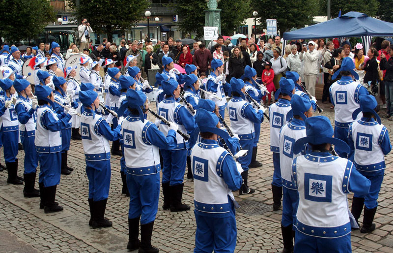 法轮功学员的游行队伍经过哥德堡的最繁华地区。尽管天上下着阵阵小雨,人们依然纷纷驻足观看游行;欧洲天国乐团的演奏更是吸引了四面八方的民众。很多游人从而有机会了解有关什么是法轮功、及中共迫害法轮功的真相。