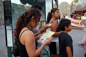 下午三时开始,法轮功学员分成多个小组在多个公园、及繁华街道边的草坪炼功,向来自各地的游客和当地民众介绍法轮功,同时揭露中共对法轮功修炼者的残酷迫害。许多人是第一次听到法轮功的情况,听法轮功学员介绍后,他们久久伫立在路边,观看法轮功学员炼功,有的人还模仿法轮功学员的动作。