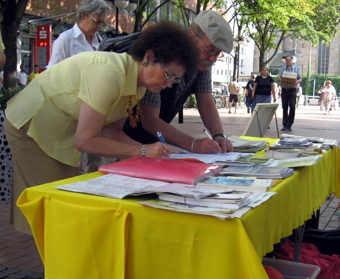 ![]() 德国民众在“制止中共活体摘取法轮功学员器官”的征签簿上签名 |