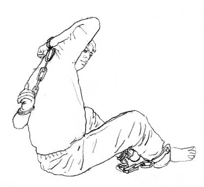 在给申全会施用特殊“背剑”(一只手从肩上拉向后背,另一只手从腋下向上拉向后背铐一起)酷刑时,还叫一个人坐在申全会身上,痛的申全会几次昏死。从绑架至今已一年之久,遭酷刑迫害的申全会到现在一条腿仍旧麻木,胳膊伸开,却不能够着脖子,胸部一直疼痛难忍。