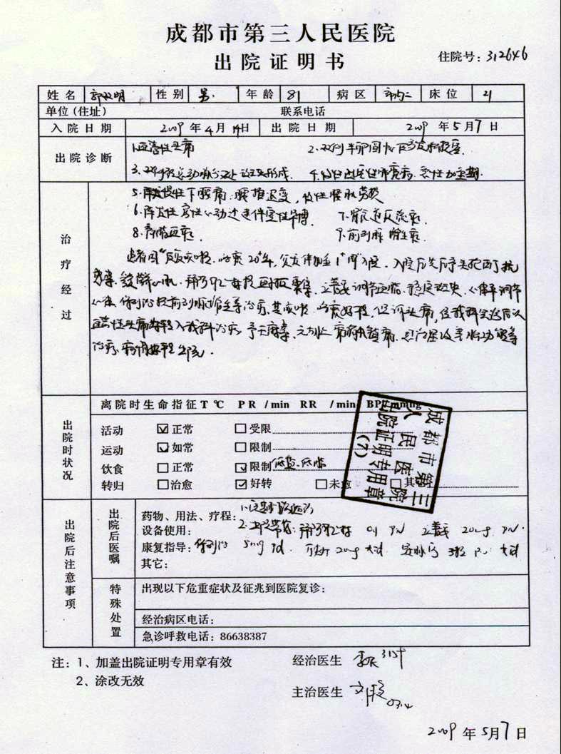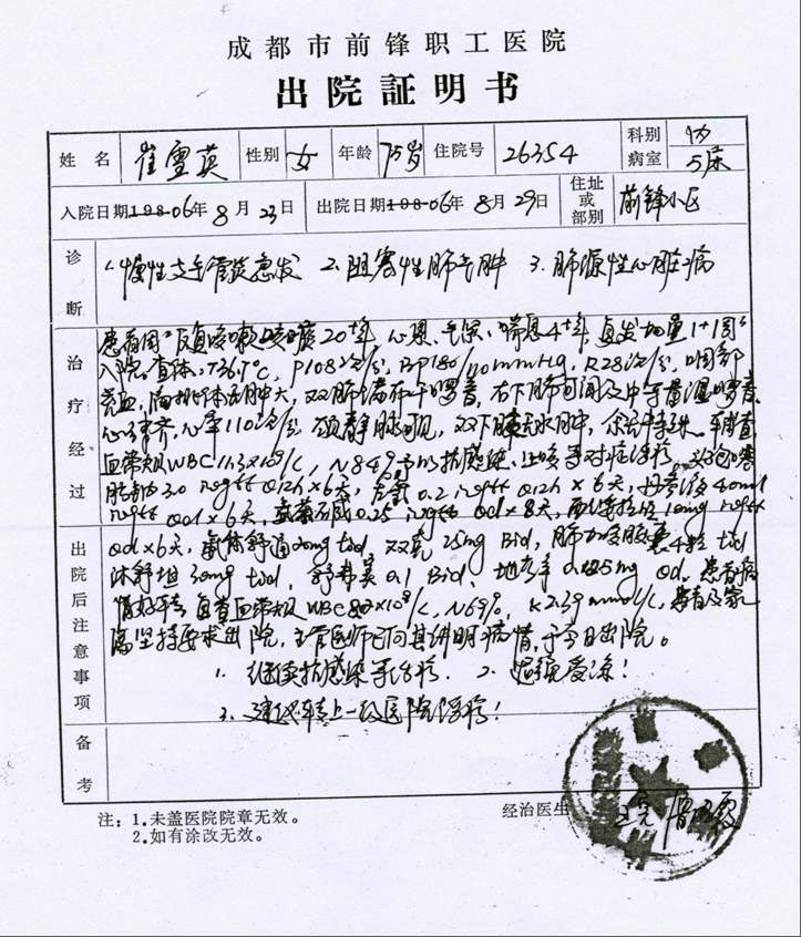 ![]() 郭利蓉母亲(崔学英)出院证明,显示其所患重症:心脏病、肺气肿、慢性支气管炎 | ![]() 郭利蓉父亲(郭双明)出院证明,显示其所患九种重症 |