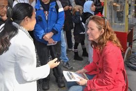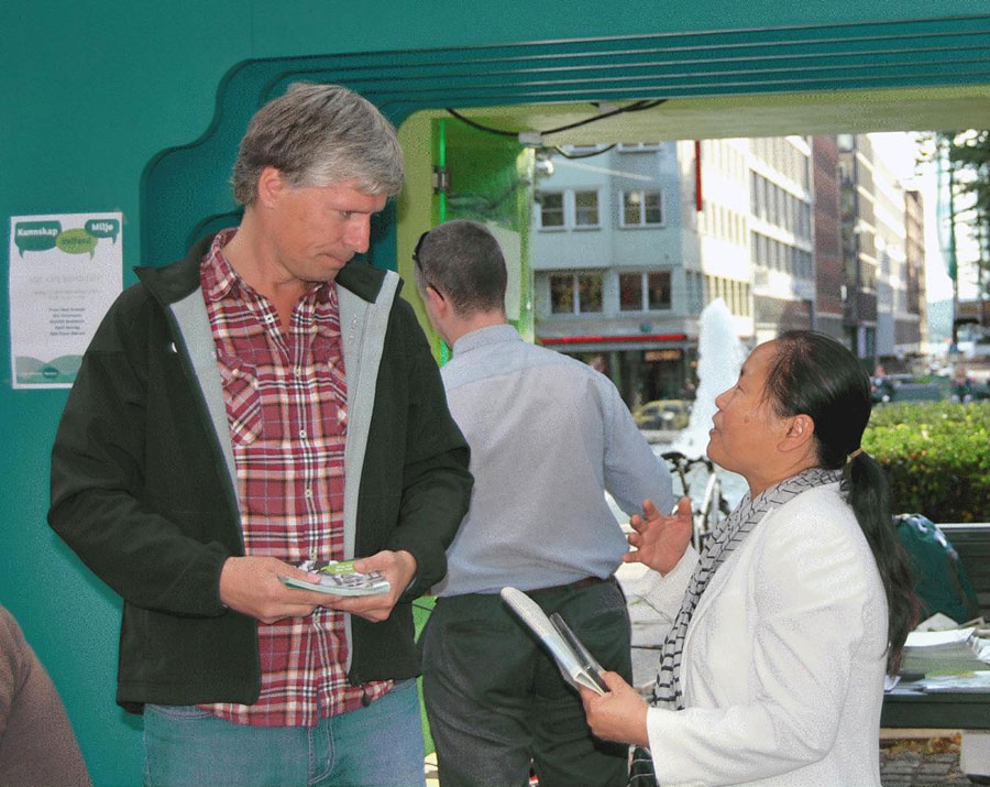 ![]() 左派党奥斯陆第二参选人乌拉·埃尔万斯图恩听取法轮功学员介绍《九评共产党》 |