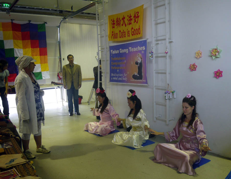 学员在摊位里和展馆的露天场地上演示了法轮功功法。人们被优美的音乐和舒缓的功法动作所吸引,纷纷驻足观看,也有人拿出相机,拍下这些美好的镜头。